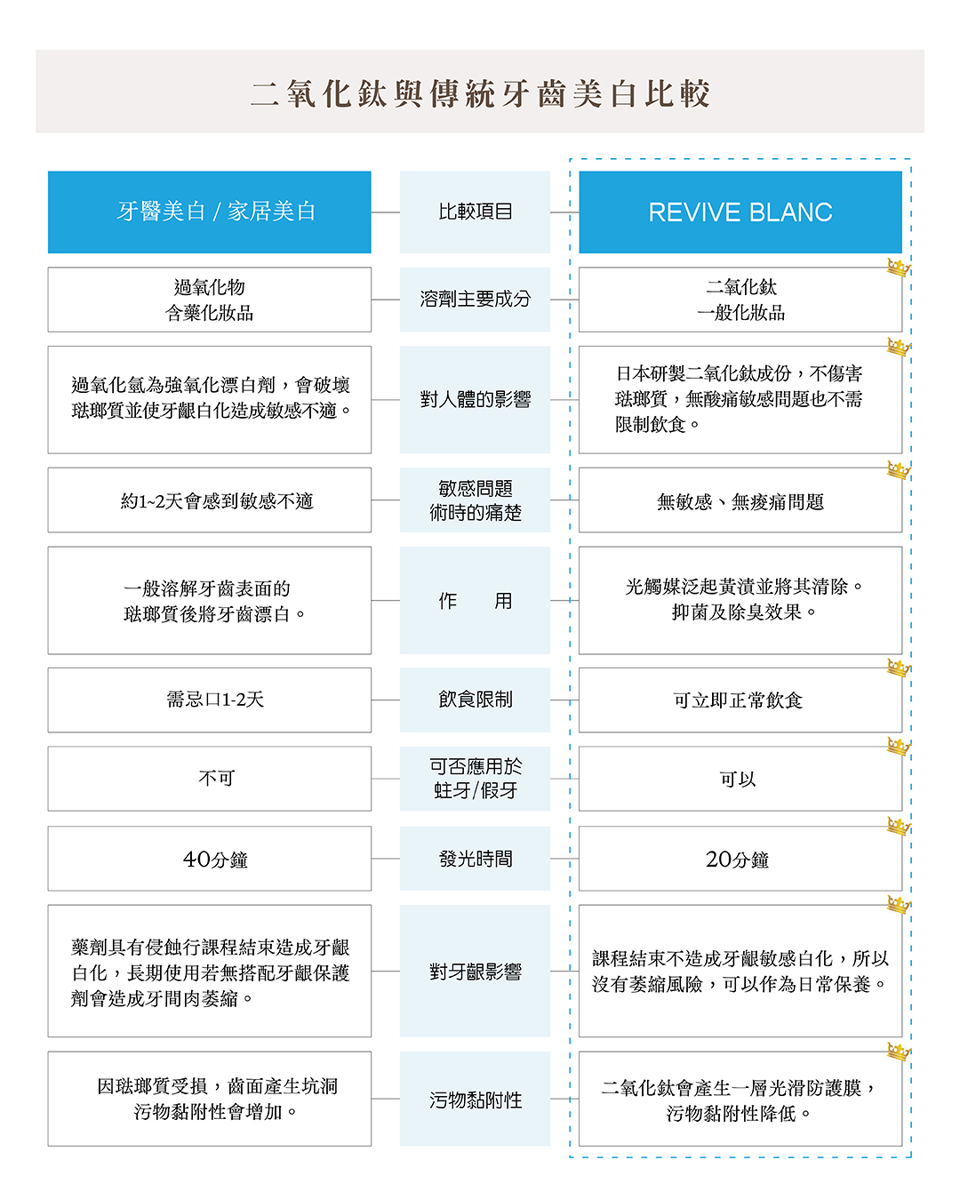 二氧化鈦為新世代的淨齒成份,以溫和無刺激為核心、不需忌口、不傷害牙齦與琺瑯質,與傳統方式相比更安全、舒適,也能在短時間內呈現自然亮白效果。